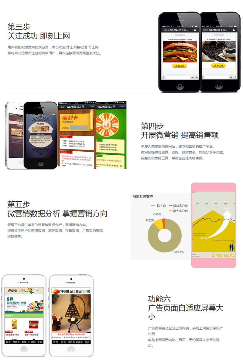 當(dāng)越來越多的企業(yè)在微信上建立公共賬號(hào)時(shí),我們可以發(fā)現(xiàn)微信以迅猛之勢(shì)滲透到我們生活中的每個(gè)角落,可以說微信的前景被普遍看好。在此背景之下,金良網(wǎng)絡(luò)緊跟市場(chǎng)需求,推出無線wifi微信認(rèn)證功能,幫助企業(yè)更好的管理WiFi無線網(wǎng)絡(luò)以及產(chǎn)品營銷推廣。 1、微信營銷面臨難題 雖然微信營銷方法多種多樣,但是每個(gè)企業(yè)微信運(yùn)營者都也都將面臨一個(gè)重要難題,那就是:微信粉絲的積累問題。企業(yè)應(yīng)以什么方式積累粉絲量?如何在積累粉絲量的同時(shí)不掉粉?怎么才能吸引粉絲自愿關(guān)注該企業(yè)公共賬號(hào)?與此同時(shí)分析粉絲的消費(fèi)能力、消費(fèi)習(xí)慣、關(guān)注熱點(diǎn)等并制定出針對(duì)性的營銷策略等問題也非常重要。 可以說,企業(yè)公共賬號(hào)的粉絲量是品牌傳播、商業(yè)推廣的基本條件,但在微信前期如何在積累粉絲量的同時(shí)又能保證不掉粉是微信營銷的第一步,并且也是企業(yè)將面臨一個(gè)瓶頸性問題,那么該如何快速收集到目標(biāo)粉絲呢? 金良網(wǎng)絡(luò)無線wifi的微信認(rèn)證上網(wǎng)功能,則為運(yùn)營商解決了這一難題。 2、Wifi營銷的飛速發(fā)展 近幾年WIFI營銷這個(gè)項(xiàng)目可以說是炙手可熱,就連移動(dòng)互聯(lián)網(wǎng)的大佬都想進(jìn)來湊個(gè)熱鬧。總體上來講,WIFI營銷分為三個(gè)階段,第一個(gè)階段,是WIFI營銷的初級(jí)階段,這個(gè)時(shí)候,商家認(rèn)識(shí)到了WIFI網(wǎng)絡(luò),也提供了一個(gè)免費(fèi)的WIFI信號(hào)給到客戶.但是因?yàn)樽陨韺拵У膯栴},還有本身硬件問題,導(dǎo)致客戶無法進(jìn)行良好的體驗(yàn),而且每次要咨詢店員密碼,體驗(yàn)不是很好. WIFI營銷的第二個(gè)階段改良了WIFI的驗(yàn)證方式,客戶可以自助獲得上網(wǎng)密碼.另外也提供了專門用來支持多人上網(wǎng)的WIFI設(shè)備,所以體驗(yàn)有所提升。其主要模式是賺取第三方的廣告費(fèi)用,設(shè)備免費(fèi)給商家使用.但是從目前的情況來看,雖然它占據(jù)了大量的機(jī)場(chǎng)和快餐店鋪,但是商業(yè)模式還是值得商榷的問題. WIFI營銷的第三個(gè)階段,應(yīng)該是大數(shù)據(jù)階段,移動(dòng)互聯(lián)網(wǎng)產(chǎn)業(yè)研究院最近推出的微信營銷系統(tǒng),不僅有WIFI的基礎(chǔ)功能.同時(shí)增加了線下用戶的大數(shù)據(jù)分析.為不同層次的客戶,提供不同類型的廣告展示. 3、當(dāng)微信與無線wifi相結(jié)合 大數(shù)據(jù)商業(yè)化、商品化的模式’正有望成為繼門戶網(wǎng)站、搜索引擎、社交媒體之后新一波的創(chuàng)業(yè)浪潮和產(chǎn)業(yè)革命。WIFI作為移動(dòng)大數(shù)據(jù)的入口,即將展示它最有魅力的一面。而金良wifi是一站式智能營銷平臺(tái),其中功能之一的微信認(rèn)證就是幫助商家微信獲得更多目標(biāo)粉絲的重中之重。在剛剛過去的一年里,金良wifi足跡遍布全國各地,在此之后,顧客如果想在景悅城內(nèi)免費(fèi)上網(wǎng),只需一鍵關(guān)注商家微信掃描二維碼即可,簡單方便!這樣一來,店內(nèi)客流量百分百轉(zhuǎn)化為微信粉絲量,目標(biāo)顧客迅速成為商場(chǎng)微信粉絲,后續(xù)的微信營銷也就隨之順理成章。 對(duì)普通用戶來說,使用微信認(rèn)證來獲取免費(fèi)Wi-Fi服務(wù)方便快捷,不用再去詢問是否有Wi-Fi、鏈接密碼是多少等;對(duì)于提供免費(fèi)Wi-Fi的商家而言,此舉可減少客服人員的工作量,大大節(jié)省工作人員時(shí)間成本,并輕松獲取大量的目標(biāo)粉絲,實(shí)在是一舉兩得之好事。 |