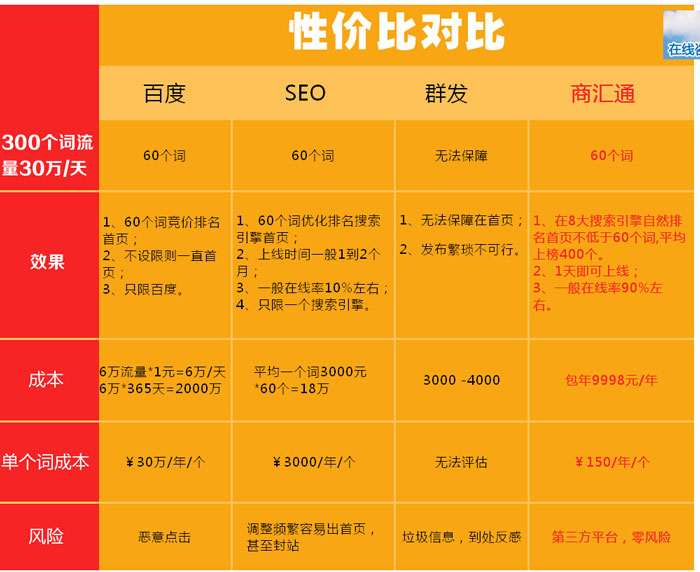 1、網絡營銷成為新時代的寵兒!互聯(lián)網的發(fā)展,讓越來越多的人開始重視并選擇網絡營銷推廣!網絡營銷大大改變了企業(yè)的營銷方式! 二.企業(yè)網站宣傳推廣新助手-商匯通 "商匯通"是國內首家專注于搜索引擎首頁精準營銷的電子商務云銷平臺,整合公司8年技術積累和優(yōu)秀合作平臺,幫助客戶實現(xiàn)成百上千個精準關鍵詞自然排名8大搜索引擎首頁,方便、快捷、穩(wěn)定實現(xiàn)企業(yè)搜索引擎推廣。 三.選擇我們的十大理由 1、五大搜索引擎首頁排名推廣!